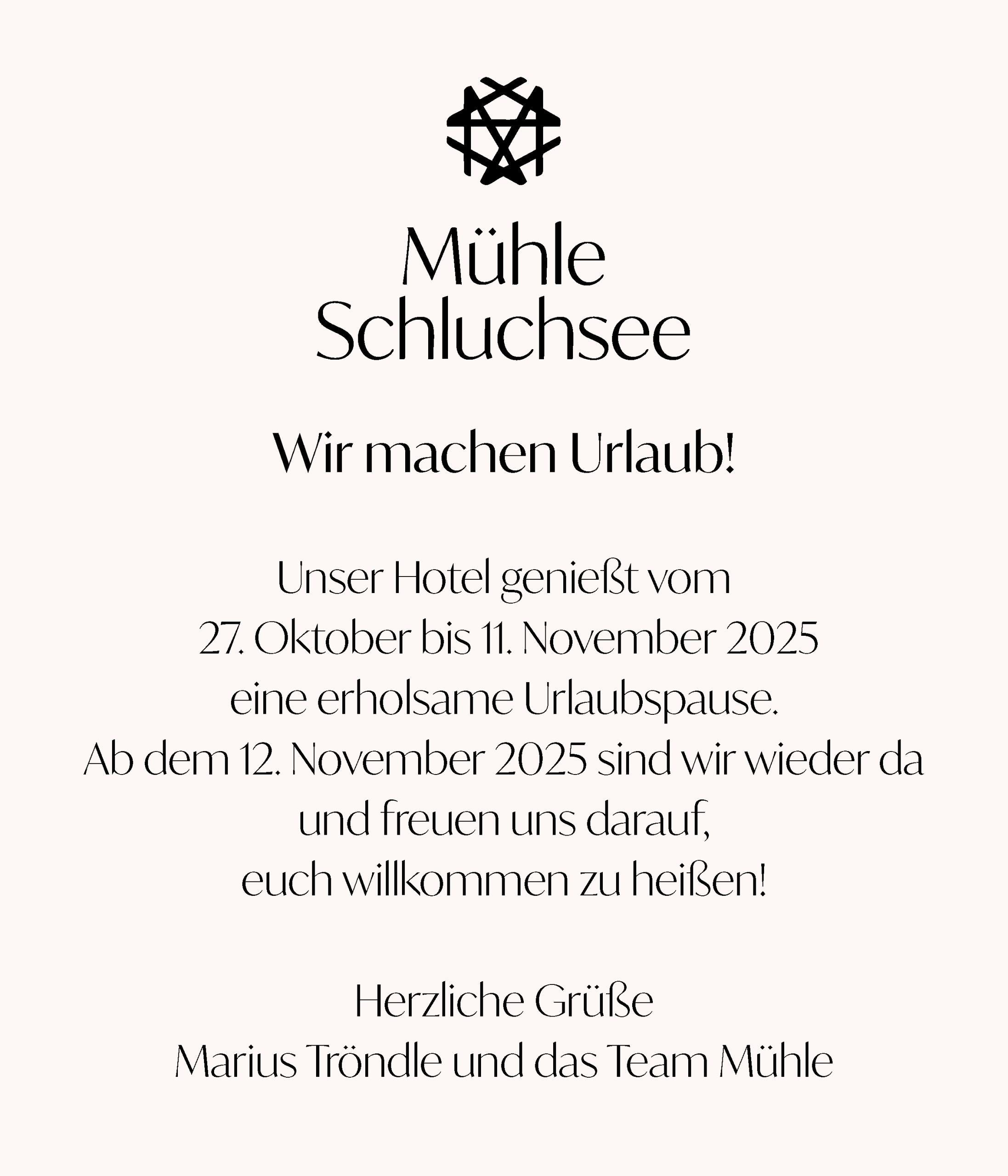 *Nur in Verbindung mit einer bestätigten Tischreservierung im Restaurant Mühle buchbar; gilt für eine Nacht inkl. Frühstück, exkl. Wellness (zubuchbar €35 p. P.) Angebot nur gültig, wenn im Hotel Mühle keine Zimmer verfügbar sind.